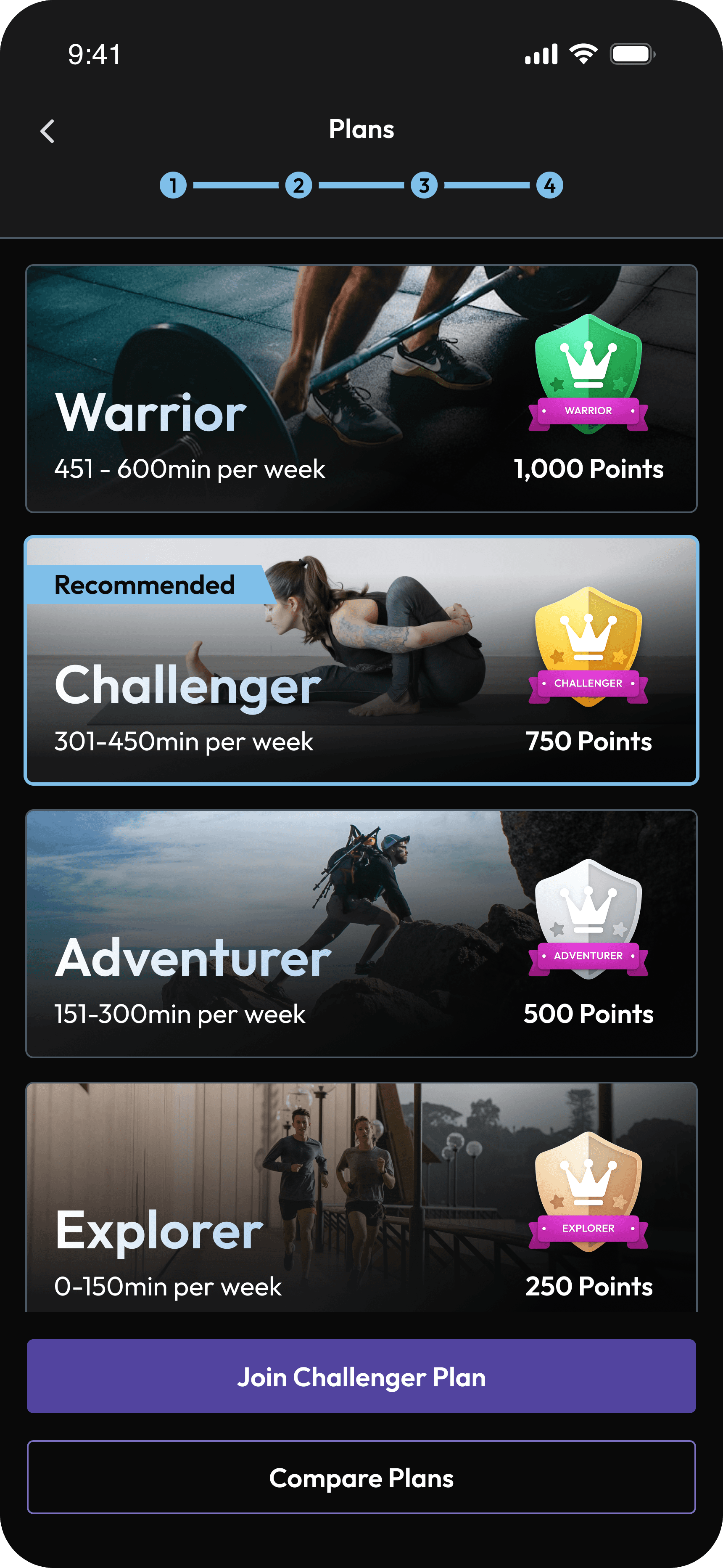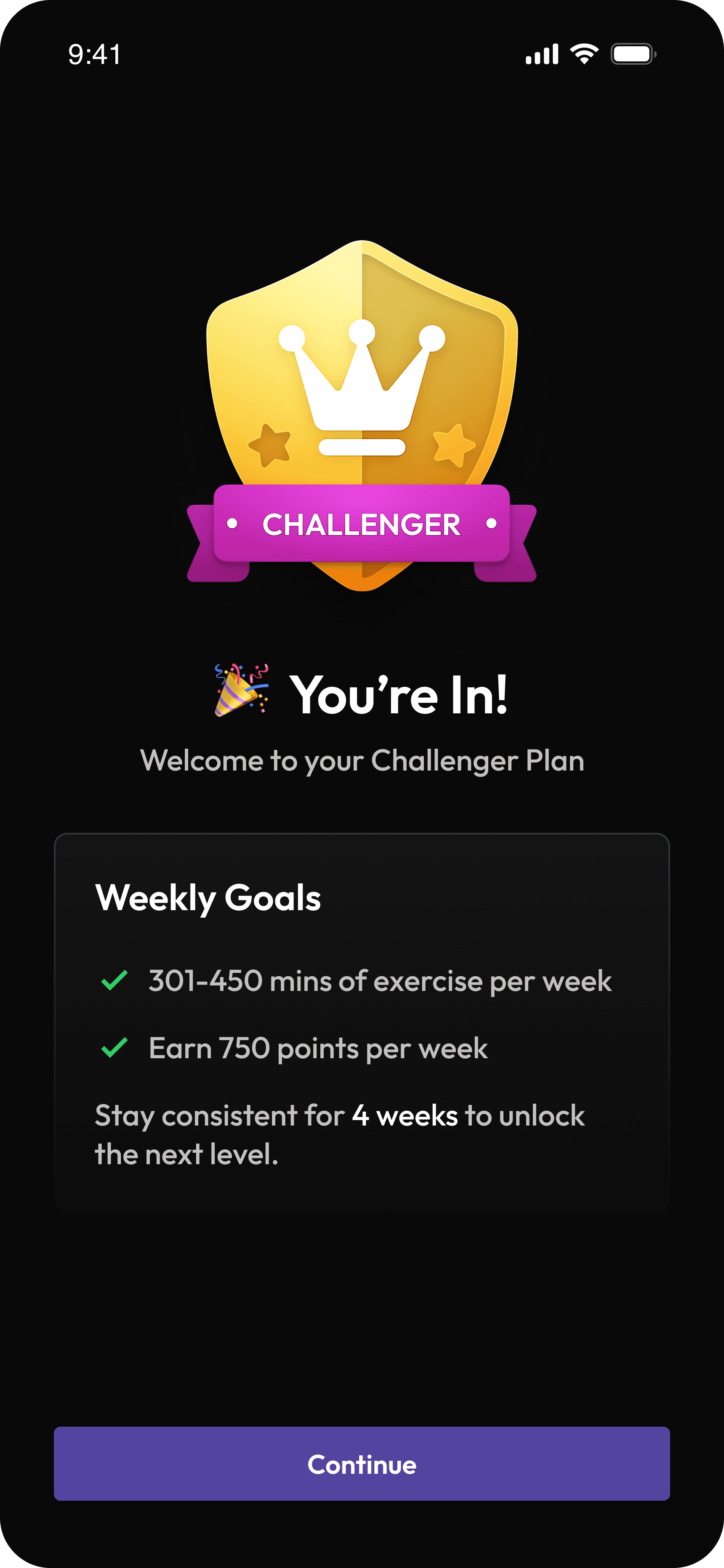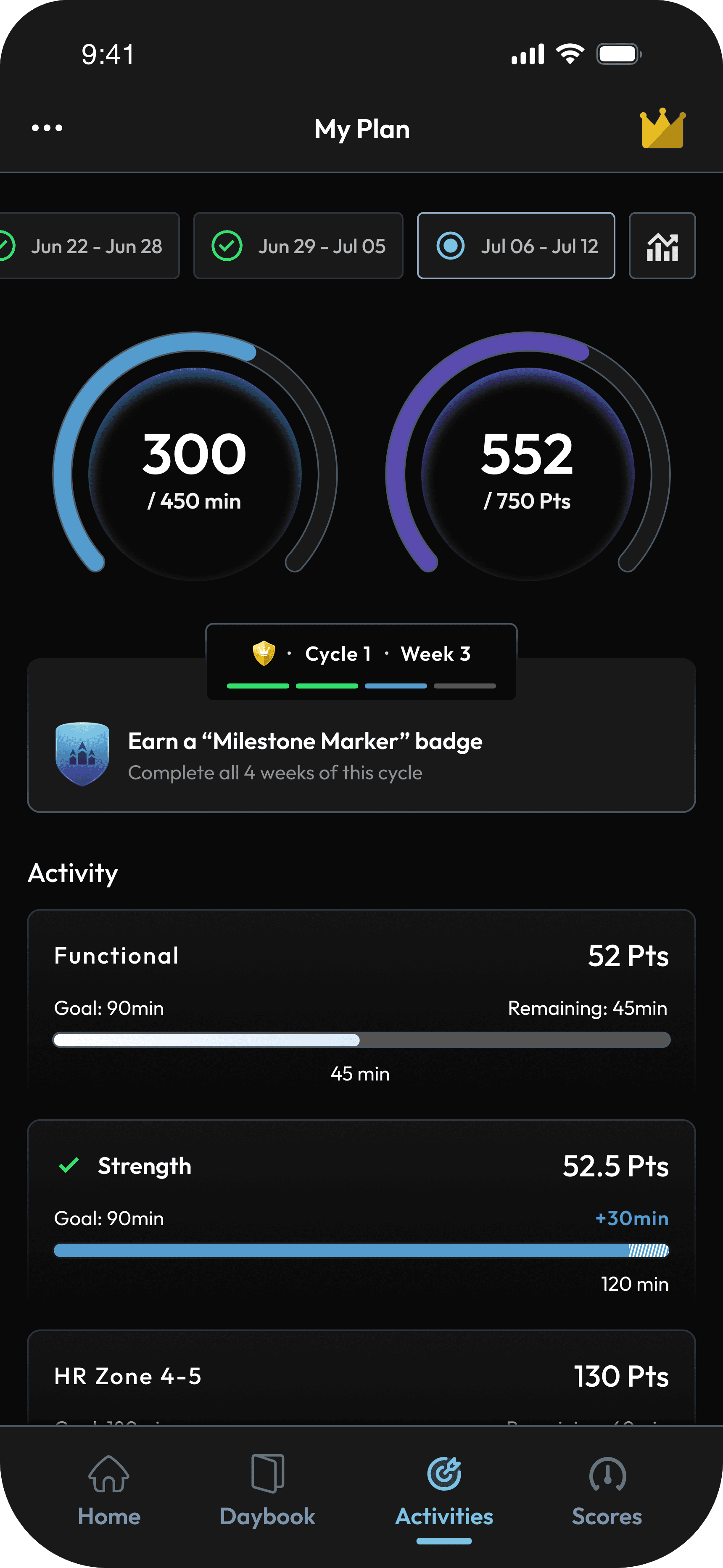 Activities was created to give purpose to all the data flowing in from users’ wearables. It turns passive tracking into guided action through four science backed tiers - Explorer, Adventurer, Challenger, and Warrior each designed around weekly goals that balance - strength, functional movement, heart rate zones, and wellness. Instead of prescribing workouts, it helps users use their own routines more effectively, focusing on balance, consistency, and long-term health rather than pressure or perfection.