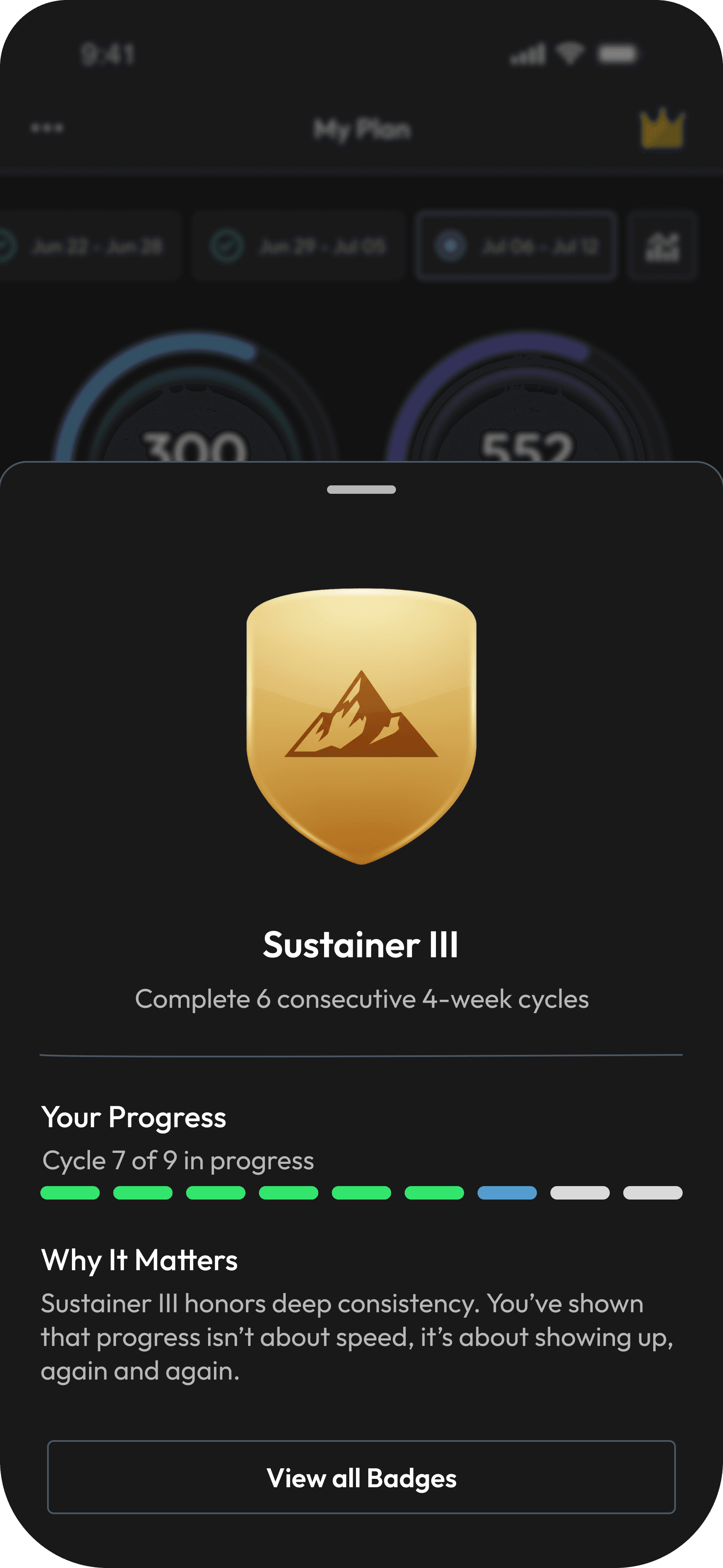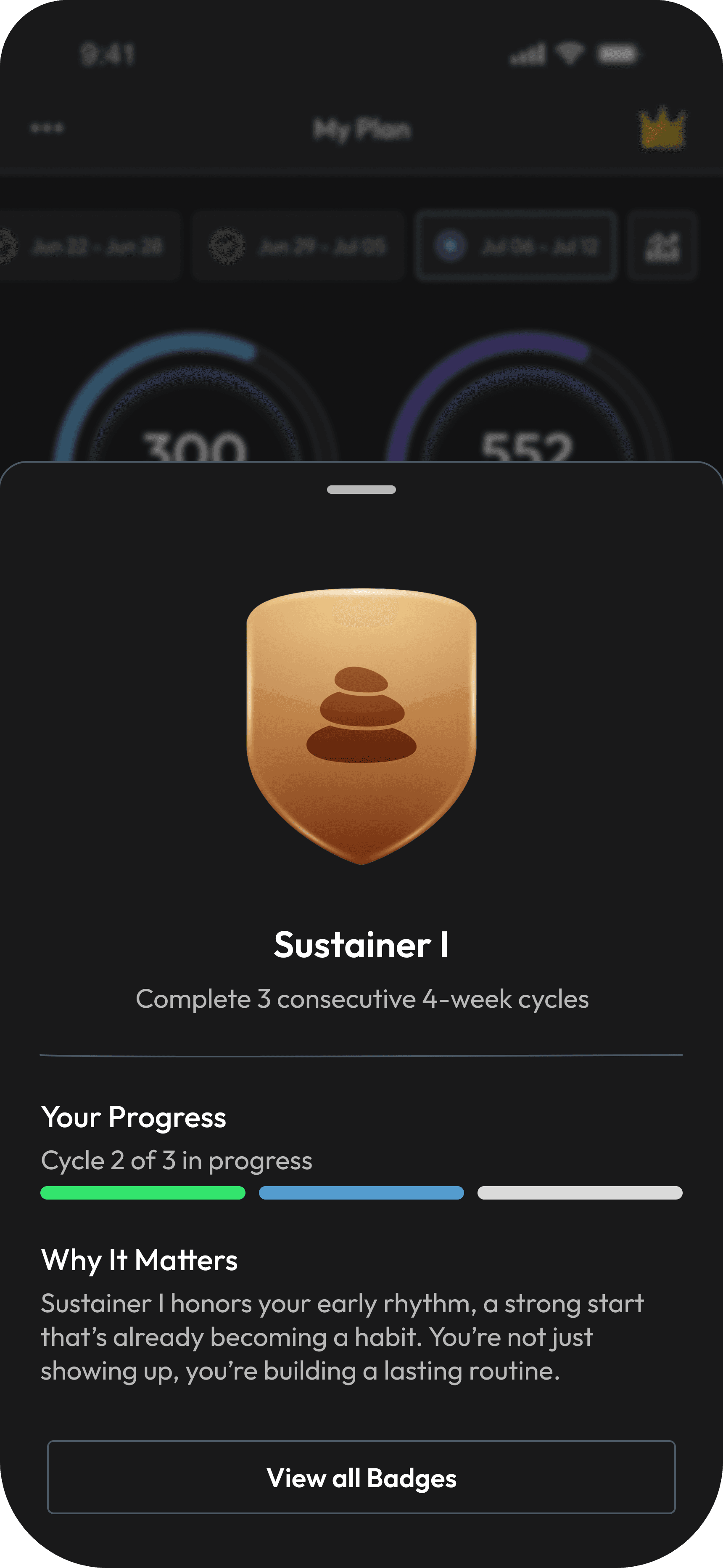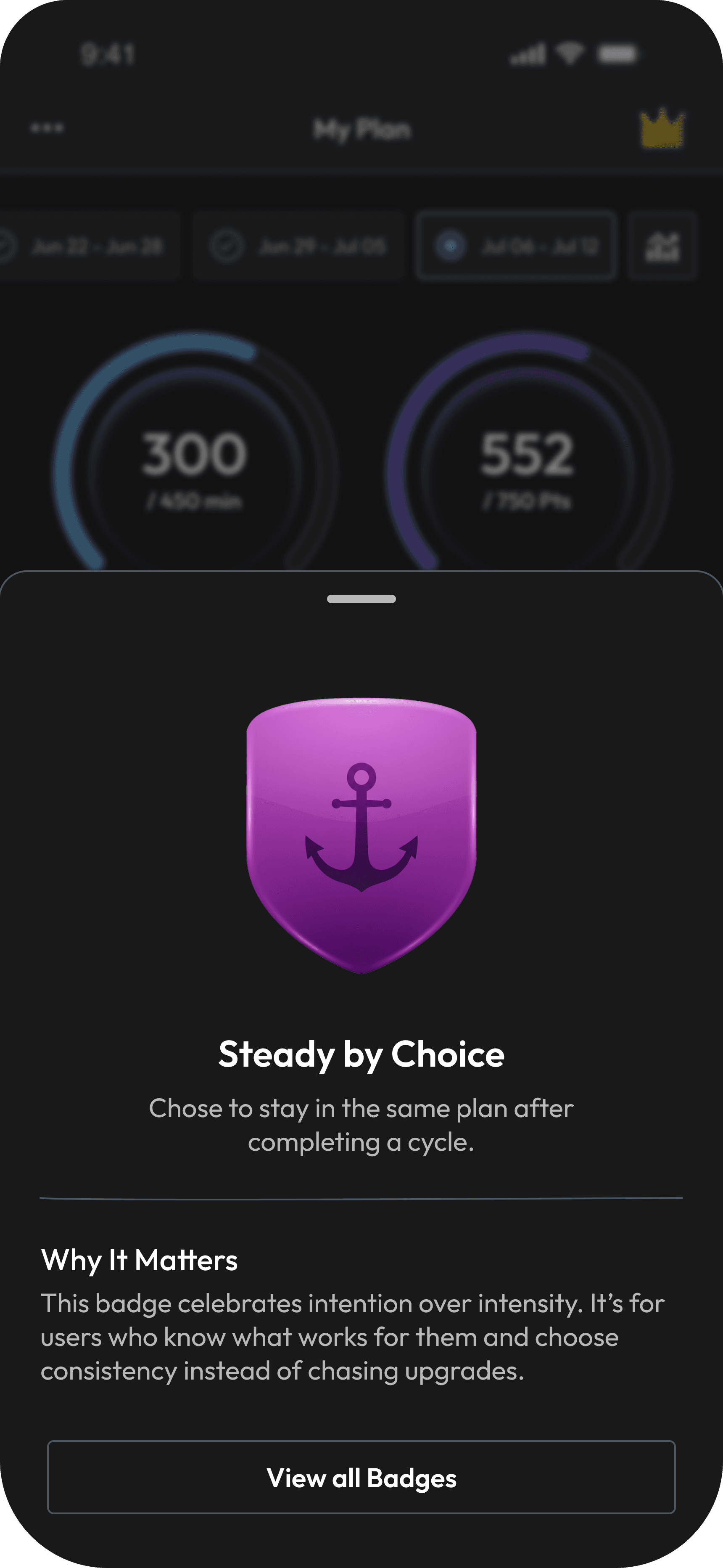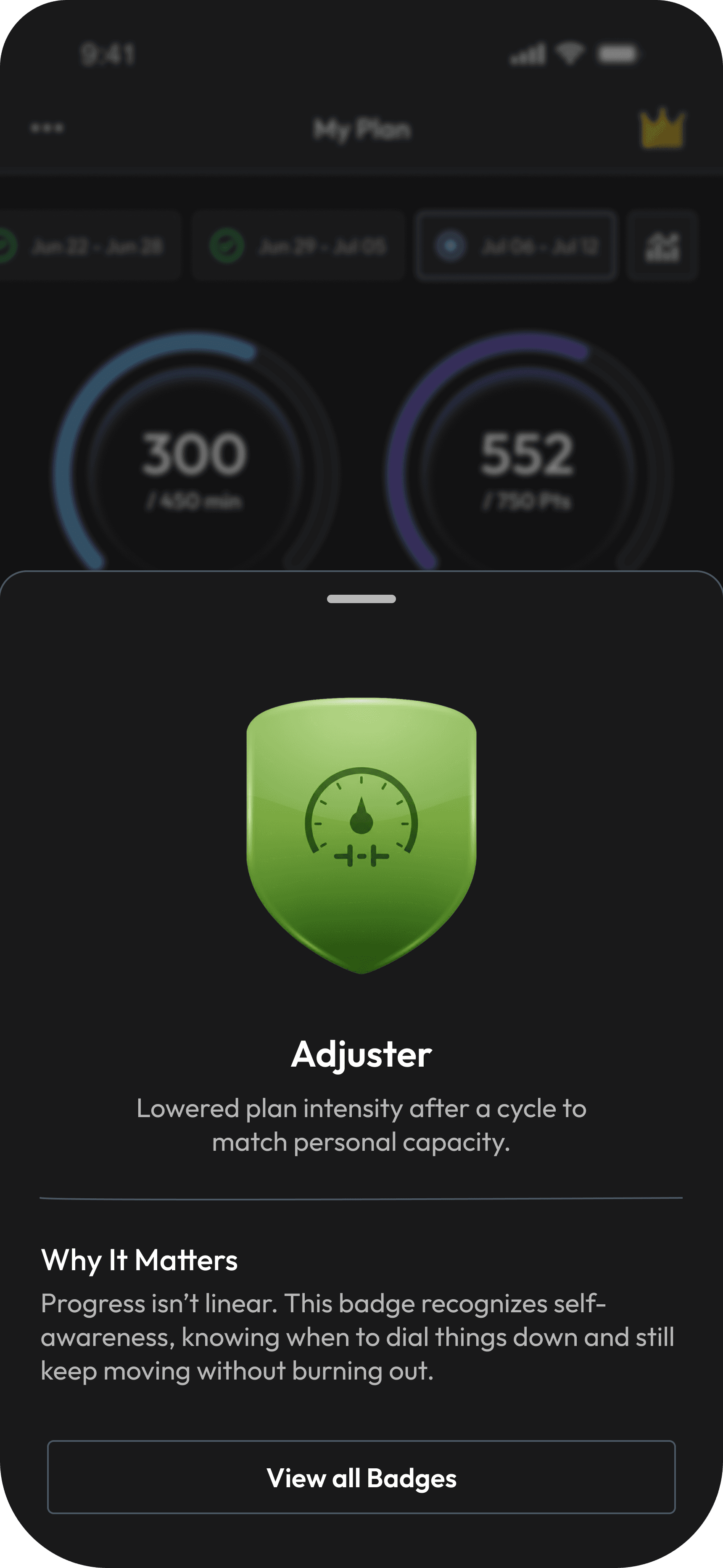 Designed a badge system that recognises progress and long-term commitment, while supporting real-life behavior with self-aware badges.