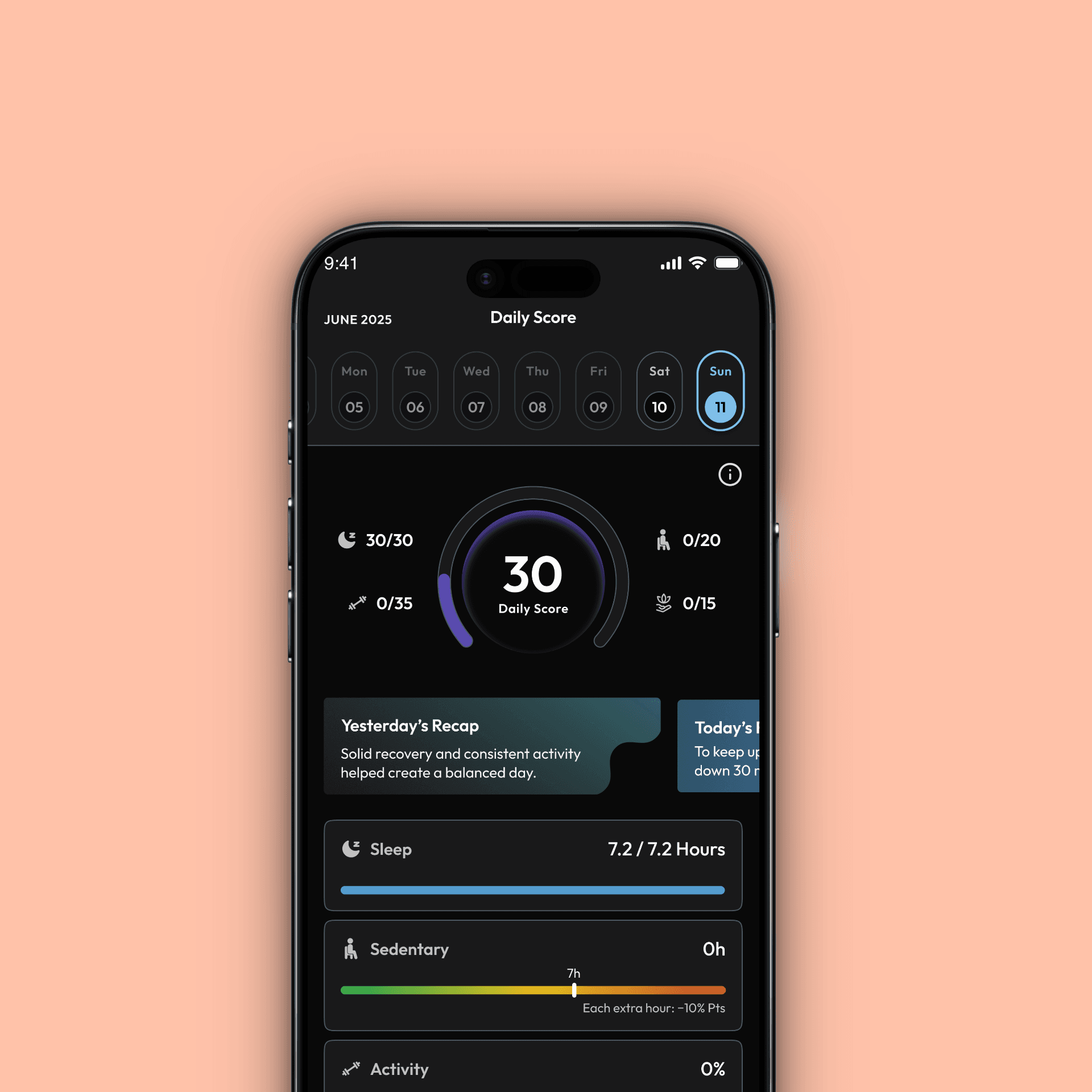 The Daily Score experience was designed to feel simple at first glance, while still offering clarity and depth when users chose to explore further. The goal was to help users understand their day without overwhelming them with numbers or logic.