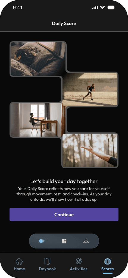 The Daily Score experience starts with a short onboarding flow that explains what the score represents, what factors contribute to it, and how it adapts to a user’s lifestyle before showing any numbers.