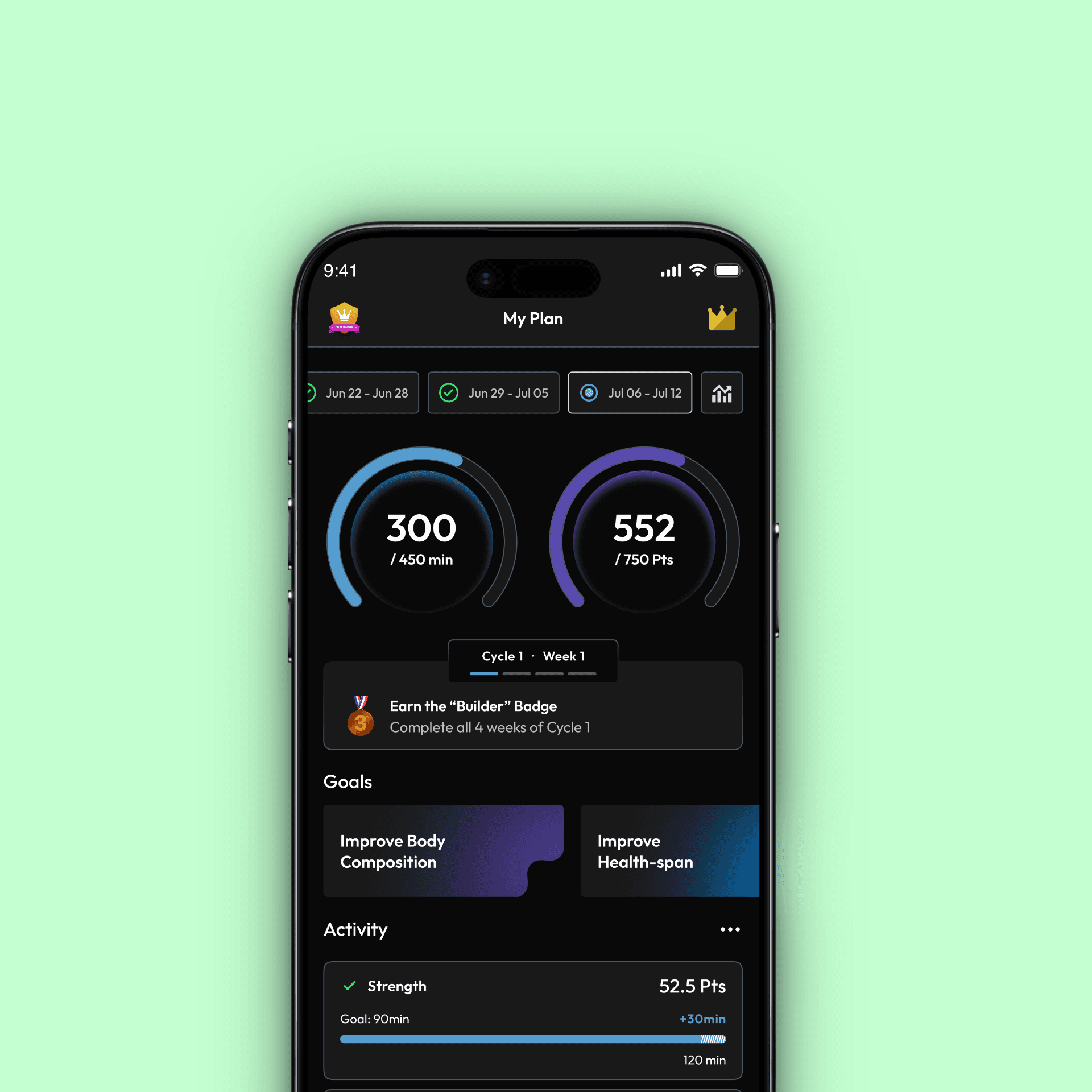 One of the biggest learnings was that health behavior isn’t linear. People have rest days, off weeks, and periods where progress stalls. Designing Daily Score and Activities required acknowledging those realities rather than optimizing for perfection.